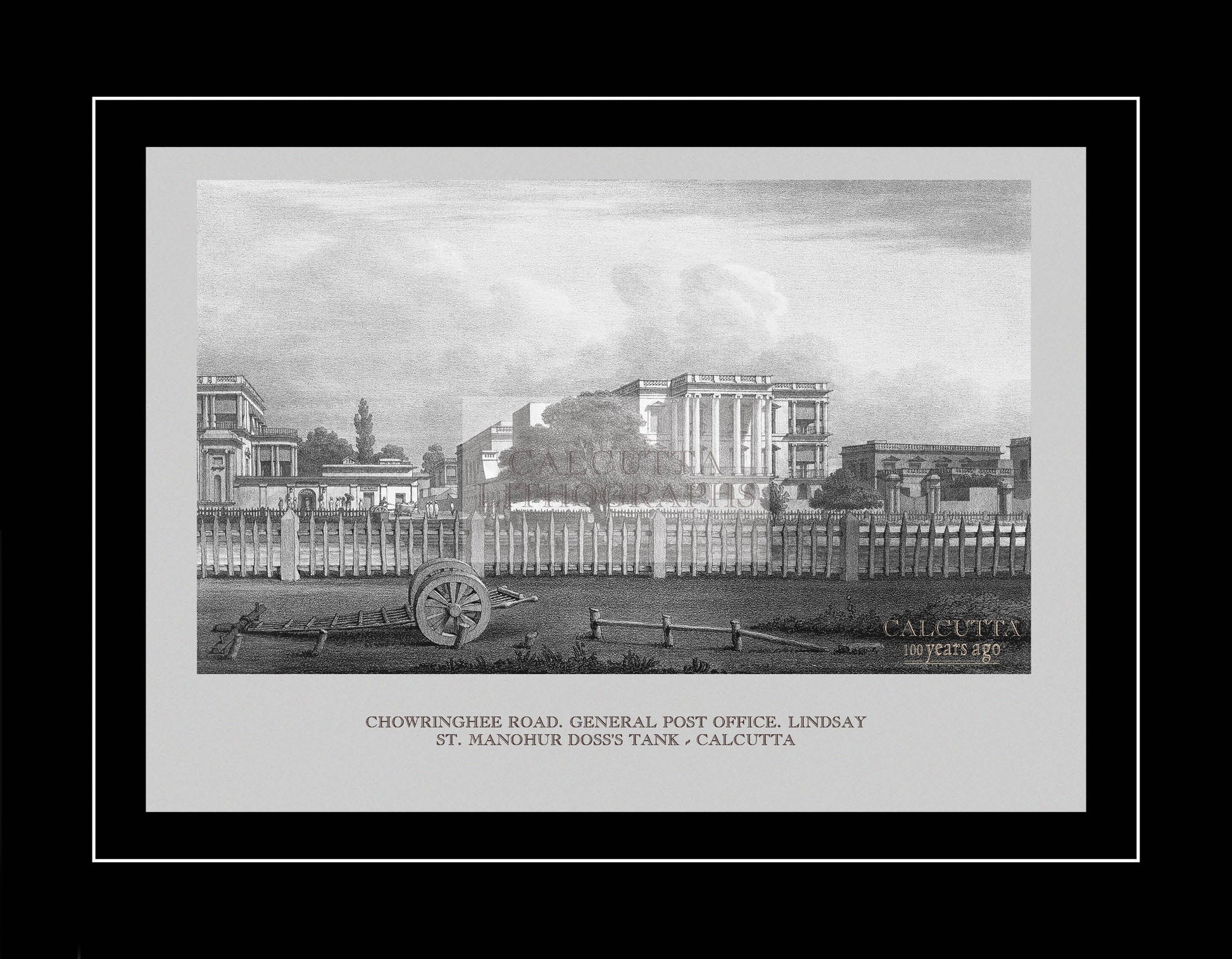 Calcutta Lithographs (Black & White) — Chowringhee Road. General Post Office. Lindsay St. Manohur Doss’s Tank – Calcutta (Code: 020) from our museum-grade series. Each monochrome lithograph is produced with archival pigment on heavyweight art paper to preserve crisp line-work and tonal depth.