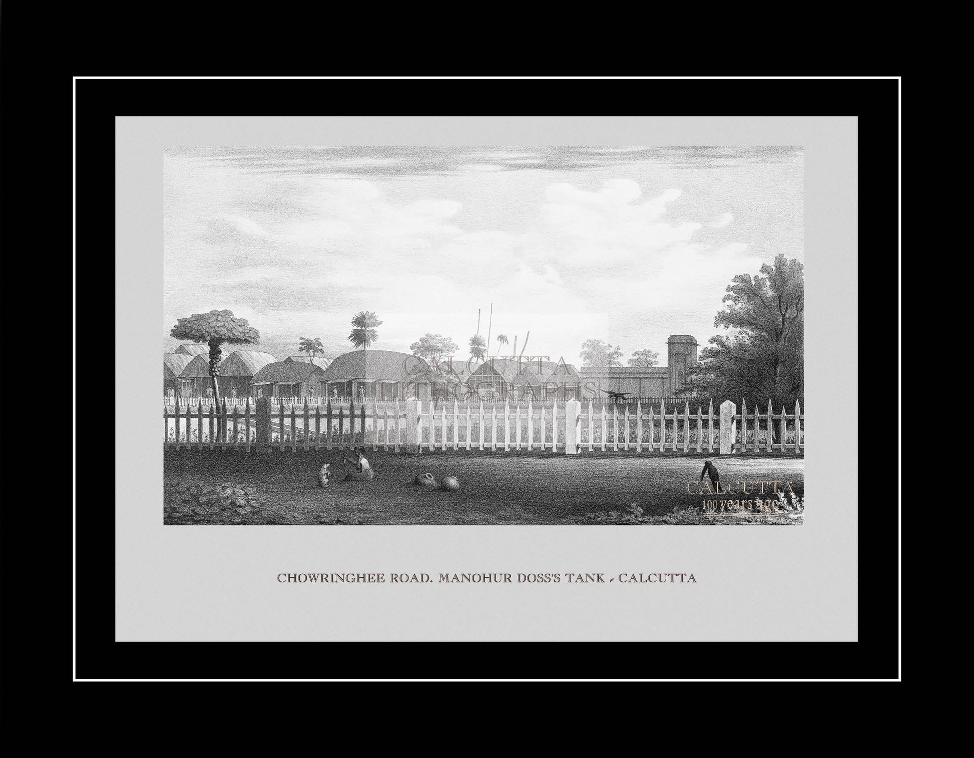 Calcutta Lithographs (Black & White) — Chowringhee Road. Manohur Doss’s Tank – Calcutta (Code: 024) from our museum-grade series. Each monochrome lithograph is produced with archival pigment on heavyweight art paper to preserve crisp line-work and tonal depth.
