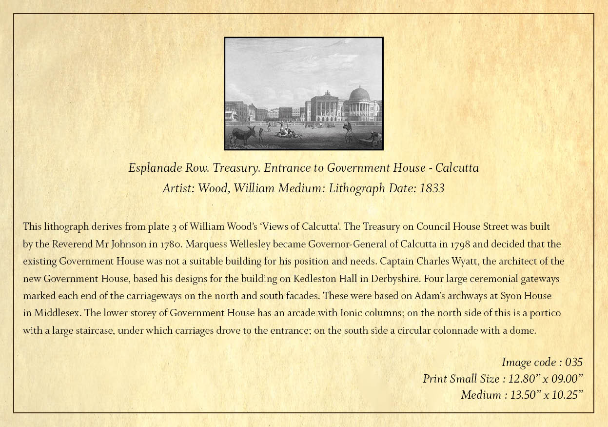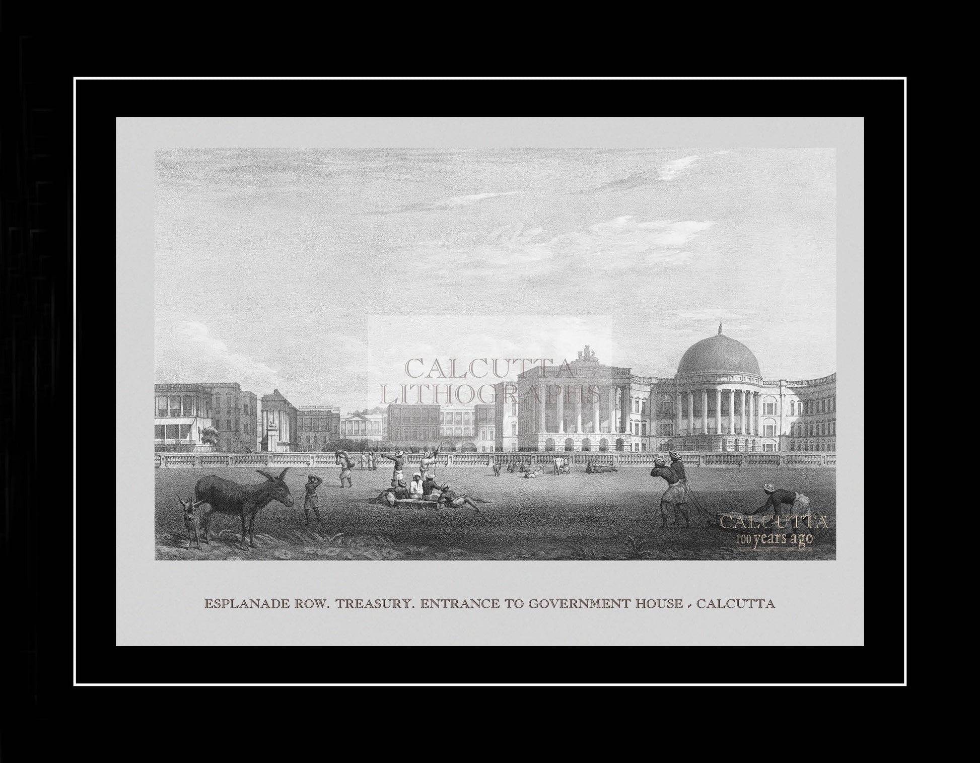 Calcutta Lithographs (Black & White) — Esplanade Row. Treasury. Entrance to Government House (Code: 035) from our museum-grade series. Each monochrome lithograph is produced with archival pigment on heavyweight art paper to preserve crisp line-work and tonal depth.