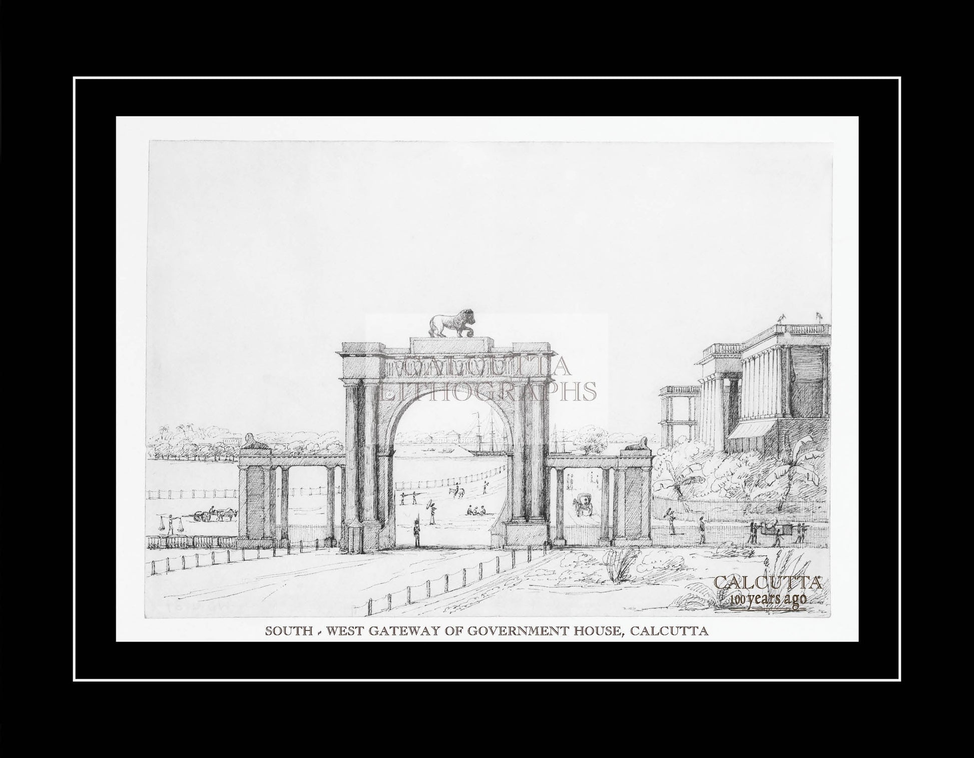 Calcutta Lithographs (Black & White) — South-West Gateway of Government House, Calcutta (Code: 050) from our museum-grade series. Each monochrome lithograph is produced with archival pigment on heavyweight art paper to preserve crisp line-work and tonal depth.