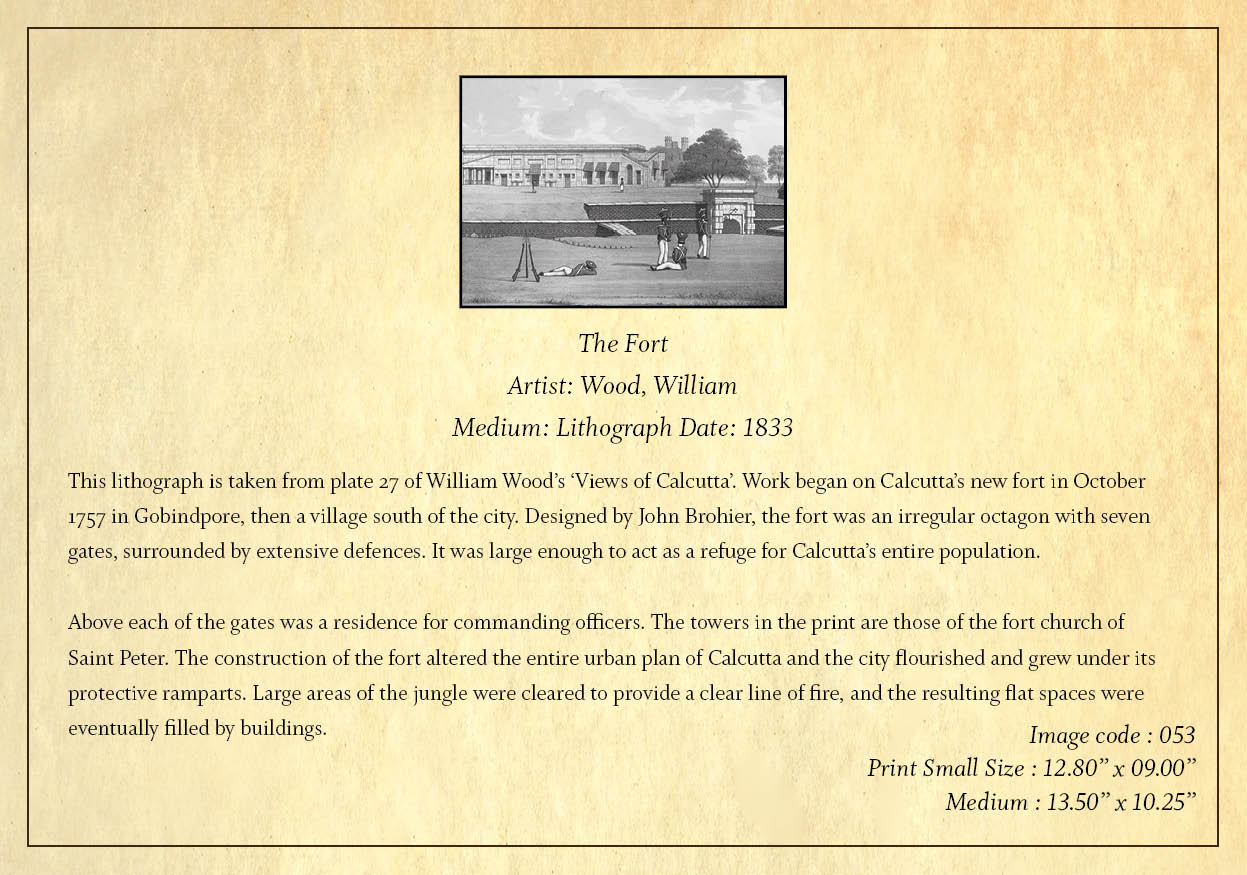 Calcutta Lithographs (Black & White) — The Fort (Code: 053) from our museum-grade series. Each monochrome lithograph is produced with archival pigment on heavyweight art paper to preserve crisp line-work and tonal depth.
